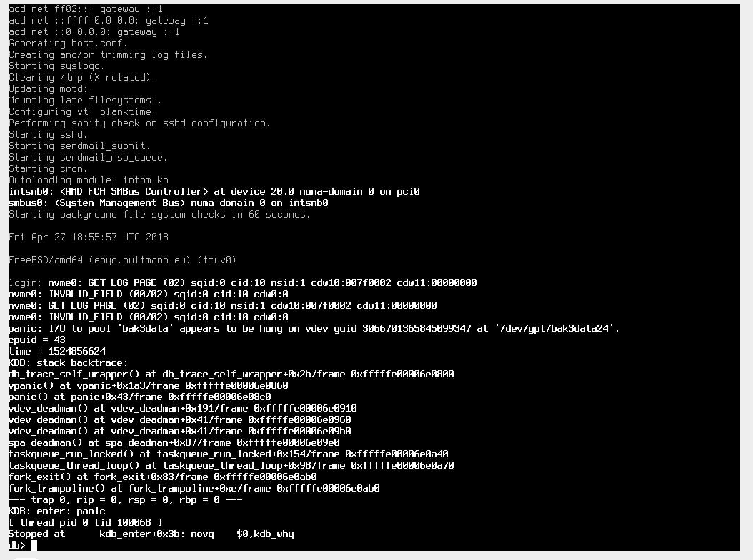 . Ignore the nvme related lines. I reproduced the same panic with them unplugged. I used the ALPHA5 memstick (r338518) to install and encountered the panic with the GENERIC kernel from that installation. I checked out r338638 which includes NUMA in GENERIC and compiled a GENERIC-NODEBUG kernel and disabled malloc debugging to get a realistic impression of the hardware's potential. The EPYC system compiled the kernel and world just fine so I attached and imported the old ZFS pool from its predecessor (a FreeBSD 11.2 system) and tried to send | recv the relevant datasets from the old pool to a new pool. This repeatedly hung after about 70-80GB. Until writes stopped the system transferred 1.0 to 1.1GB/s. I remembered reading about starvation in the NUMA code disabled it on a hunch. With NUMA disabled the system is stable (so far) and currently half way through copying 107TB from the old pool to the new pool.Sep 13 2018